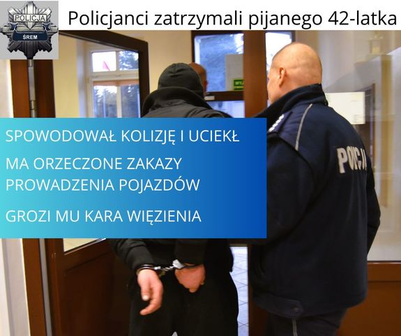 Policjanci z Komendy Powiatowej Policji w Śremie zatrzymali pijanego 42-latka, który uciekł z miejsca kolizji. Jak się okazało kompletnie nierozsądny kierujący ma też orzeczone przez sąd dwa zakazy kierowania pojazdami oraz decyzją starosty cofnięte uprawnienia do kierowania. Teraz czeka go kolejna sprawa w sądzie.