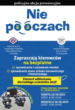 Zapraszamy kierowców do udziału w kolejnej już edycji policyjnej akcji prewencyjnej NIE PO OCZACH. W ramach przedsięwzięcia odbędzie się bezpłatne sprawdzanie i ustawianie świateł oraz sprawdzanie stanu układu kierowniczego i hamulcowego. Każdy uczestnik działań otrzyma od policjanta element odblaskowy.
