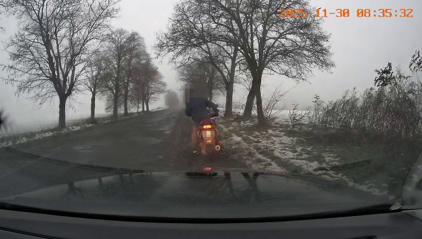 W tej sytuacji policjant zmienił kierunek jazdy i pojechał za tym motorowerzystą, który najpierw poruszał się drogą wojewódzką nr 434 w stronę Śremu, a następnie skręcił w lewo, w kierunku Kotowa. Tam zatrzymał się na poboczu, ponieważ był przekonany, że jedzie za nim radiowóz nieoznakowany Policji. Dużo się nie pomylił, bo faktycznie jechał policjant, ale swoim prywatnym autem.